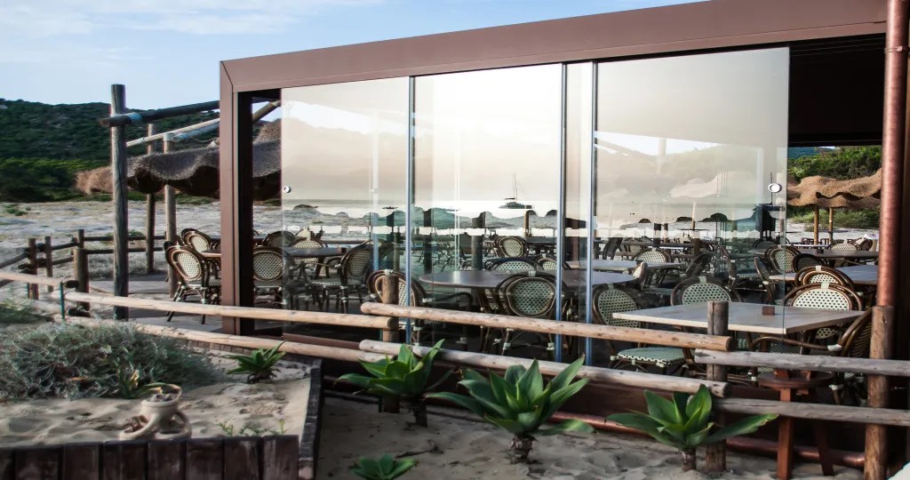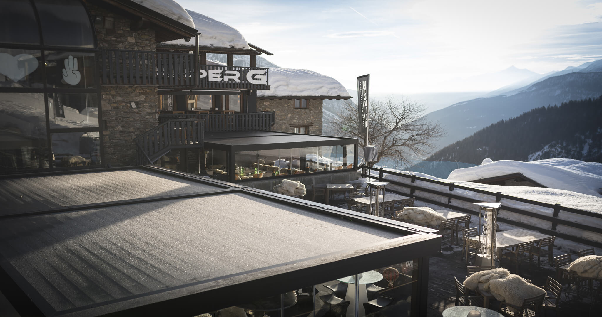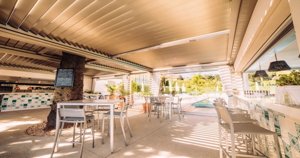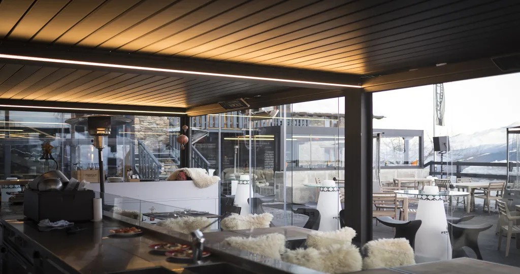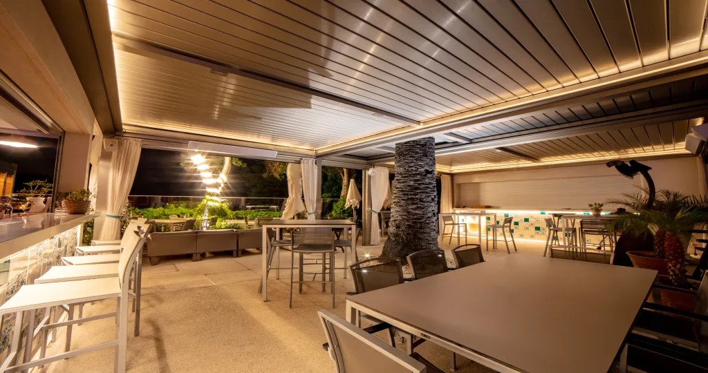 Samonosná tieniaca konštrukcia z hliníka so strieškou s nastaviteľnými lamelami tvorená obvodovým odkvapovým profilom, ktorý umožňuje otáčanie lamiel a odvod vody. Pohyb sa uskutočňuje pomocou lineárnych motorov. Garantovaná odolnosť proti vetru do triedy 6 podľa UNI EN 13561.