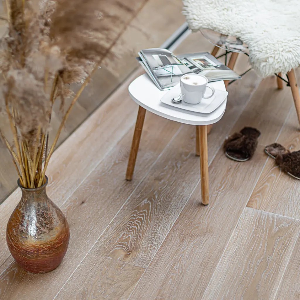 Jedinečná podlaha s opotrebovaným efektom, mierne zostarnutá a biela odkrytá v póroch brúseného dreva.